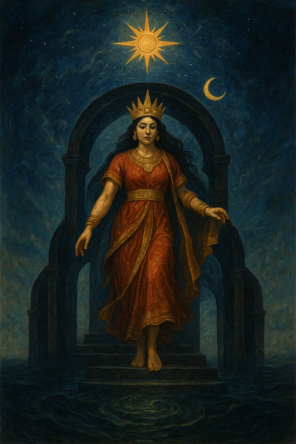 An esoteric reading of Inanna’s descent as initiatory striptease, ego death, and ontological transformation, where power is stripped, judged, and reborn through the seven gates of the underworld.